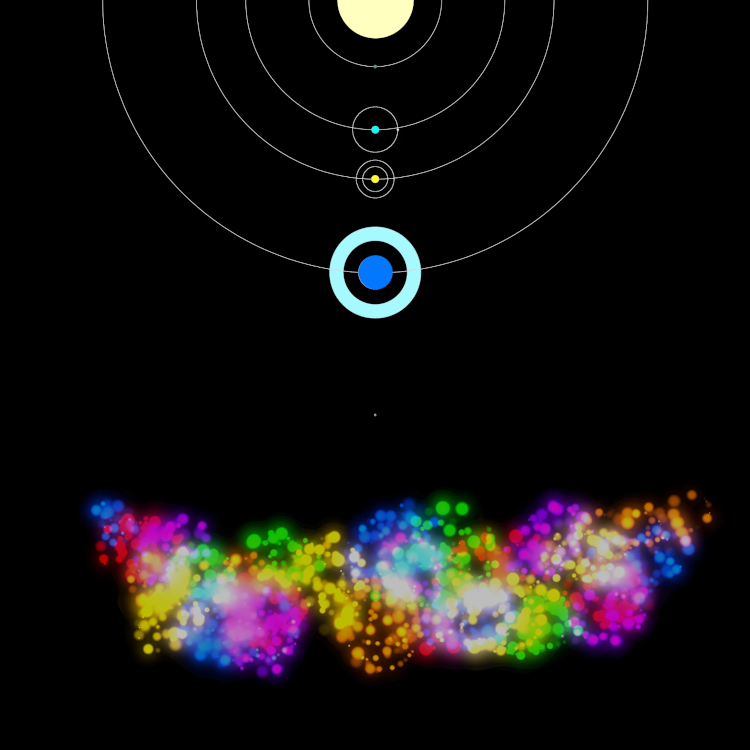 Mehrere Planeten und deren Monde umkreisen den Stern. Ein weiterer Planetoid am äußeren Rand wird von seinen Bewohnern in einer konstanten Position gehalten, um die Energie des Kaleidoskops bestmöglich nutzen zu können.